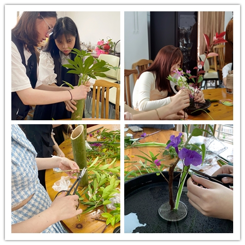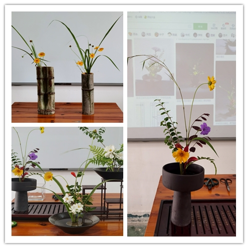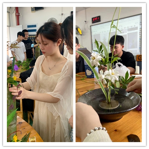 在《插花艺术》课程中,学生不仅了解了花艺的理论知识,还充分运用插花软件进行虚拟仿真训练,降低了学生插花学习的成本,还充分利用身边常见的花草树木进行插花训练。