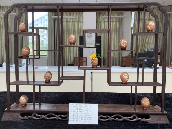 《旅游纪念品鉴赏》课程,老师从成本低的材料——蛋壳入手,废物利用,在蛋壳上结合旅游资源、社会热点主题制作旅游纪念品,学生人人参与到训练,成果丰硕,并多次在学院展览。