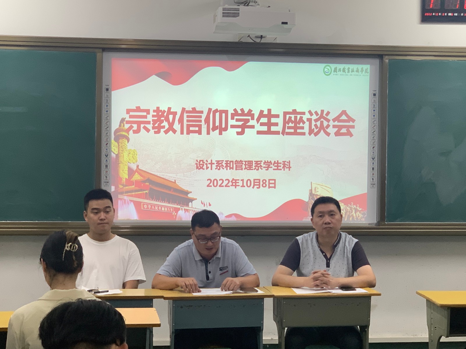 10月8日晚,设计系和管理系召开宗教信仰座谈会。设计系和管理系联合党总支傅晋飞书记、团总支吴亮书记、辅导员吴文铖老师参会。设计系和管理系2022级新生中,对是否具有宗教信仰不明确的学生参加了会议。